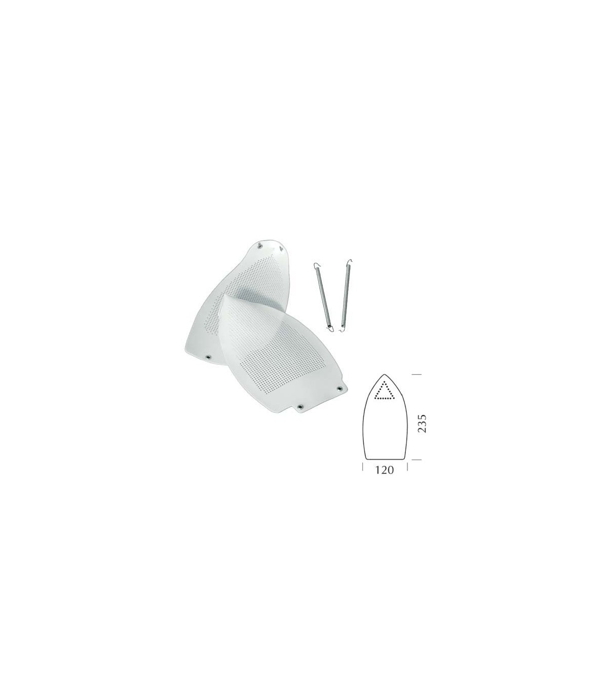 Παπουτσάκι τεφλόν για σίδερα διαστάσεων 235×120mm. Τοποθετείται εύκολα με τη βοήθεια των δυο ελατηρίων και κάνει το σίδερο να γλιστράει πάνω στα ρούχα. Δεν καίει τα υφάσματα, δεν κολλάει και δεν αφήνει γυαλάδα στα σκούρα ρούχα.