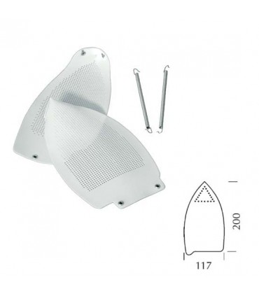 Παπουτσάκι τεφλόν για σίδερα διαστάσεων 200×117mm. Τοποθετείται εύκολα με τη βοήθεια των δυο ελατηρίων και κάνει το σίδερο να γλιστράει πάνω στα ρούχα. Δεν καίει τα υφάσματα, δεν κολλάει και δεν αφήνει γυαλάδα στα σκούρα ρούχα.